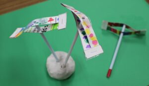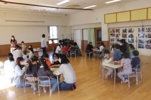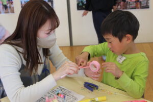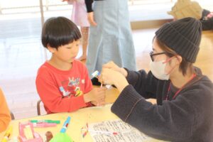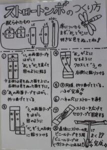 お母さんを探して、早速制作にとりかかりました(今回は、工程がやや複雑なストローとんぼなので、年長さんを対象に行いました)。