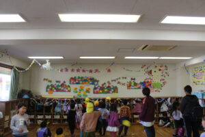 ↓↓↓そのに帰り、クラスへ戻るとめだか組、きんぎょ組、すずめ組、年少組、年中組のお友だちが部屋をきれいに飾り付けしてくれていました。「わぁー♡きれいー」と大喜びしていましたよ。