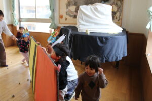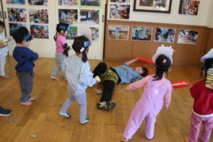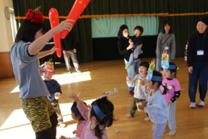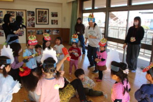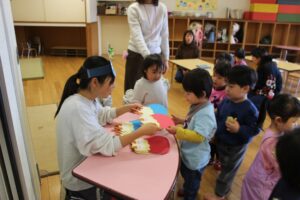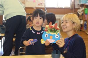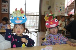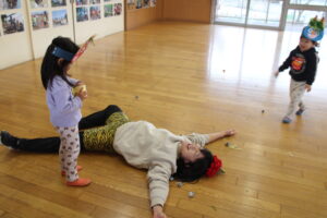 ちょっぴり涙してしまう子もいましたが、楽しく豆まきができました。