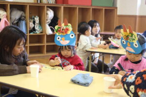 もうすぐ2月の節分があるので、プレ保育でも「おにのお面作り」をしました。