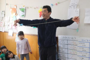 ↓年中組も年長組もコマ名人のよういち先生から、「どじょうすくい」「きんぎょすくい」「つばめ返し」「ひばり返し」「手のせ」「綱渡り」など数々の技を見せてもらい、みんな夢中で見ていました。誕生会が終わると早速自分のコマ袋を握りしめ駒場へ走っていましたよ。目指せちびっこコマ名人!!