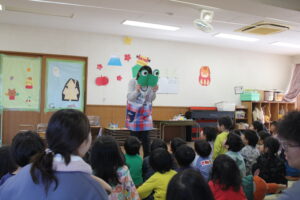 ↓すずか先生がきんぎょがチョキチョキと折り紙を切るペープサートを披露してくれました。