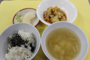 ごまごはん・みそ汁・高野豆腐の卵とじ・かぶの甘酢漬け・梨