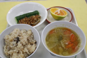 しめじごはん・鶏汁・板ずりきゅうり・サバのパン粉焼き・みかん
