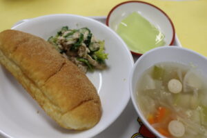 黄な粉パン・ポトフ・ささ身のごまサラダ・ゼリー