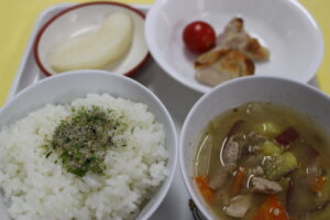 ふりかけご飯・具だくさん汁・鶏の塩レモン焼き・ミニトマト・梨