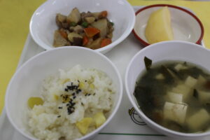 栗とさつまいものご飯・みそ汁・筑前煮・りんご