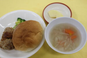 パン・野菜スープ・ハンバーグ・ブロッコリー・りんご