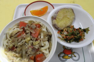 肉うどん・さつまいもの天ぷら・もやしのナムル・ぽんかん