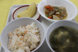 鮭ご飯・みそ汁・筑前煮・りんご