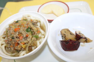 坦々うどん・大学芋・りんご