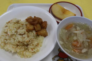バターピラフ・野菜スープ・コロコロポテト・りんご
