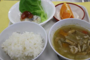 ごはん・鶏汁・鰆の甘酢あん・サラダ菜・はまさき