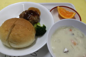 パン・シチュー・ハンバーグ・ブロッコリー・ぽんかん