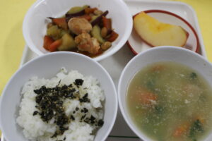 のりふりかけご飯・豚汁・さつまいもと大豆の煮もの・りんご
