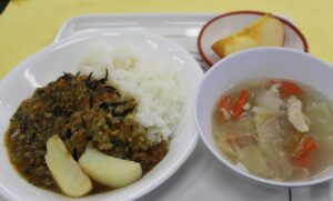 ひじきのドライカレー・野菜スープ・ベイクドポテト・りんご