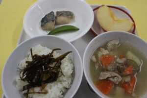 ごはん・豚汁・鰆の西京焼き・スナップエンドウ・昆布の佃煮・りんご
