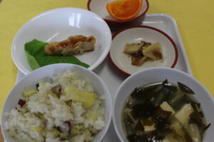 さつまいもごはん・すまし汁・かじきのから揚げ・サラダ菜・たけのこの煮物・せとか