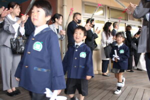 保護者、先生たちが作ってくれた花のアーチをくぐってお祝いしてもらいました。